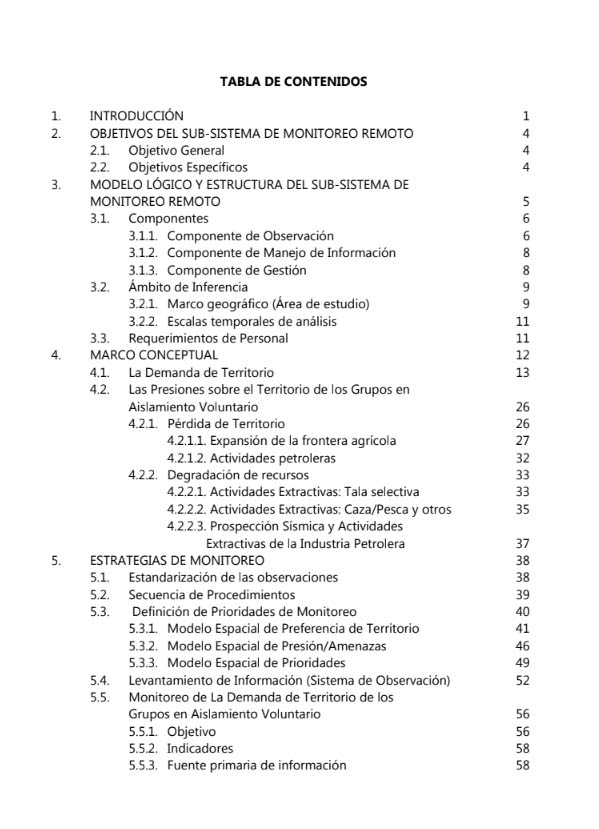 El objetivo de esta guía técnica es dar lineamientos concretos y replicables para el levantamiento eficiente de información sobre la demanda de territorio de los pueblos en aislamiento voluntario en la Amazonia norte del Ecuador y los factores de presión específicos que los afectan. Además, el objetivo general del sub-sistema de monitoreo remoto es generar la información mínima necesaria para identificar acciones efectivas para cumplir con los objetivos del PPPIA. A pesar que el presente documento ha sido elaborado hace algunos años atrás, y las herramientas tecnológicas han evolucionado, la metodología aún se encuentra vigente, siendo una tarea pendiente su actualización y posterior aplicación.